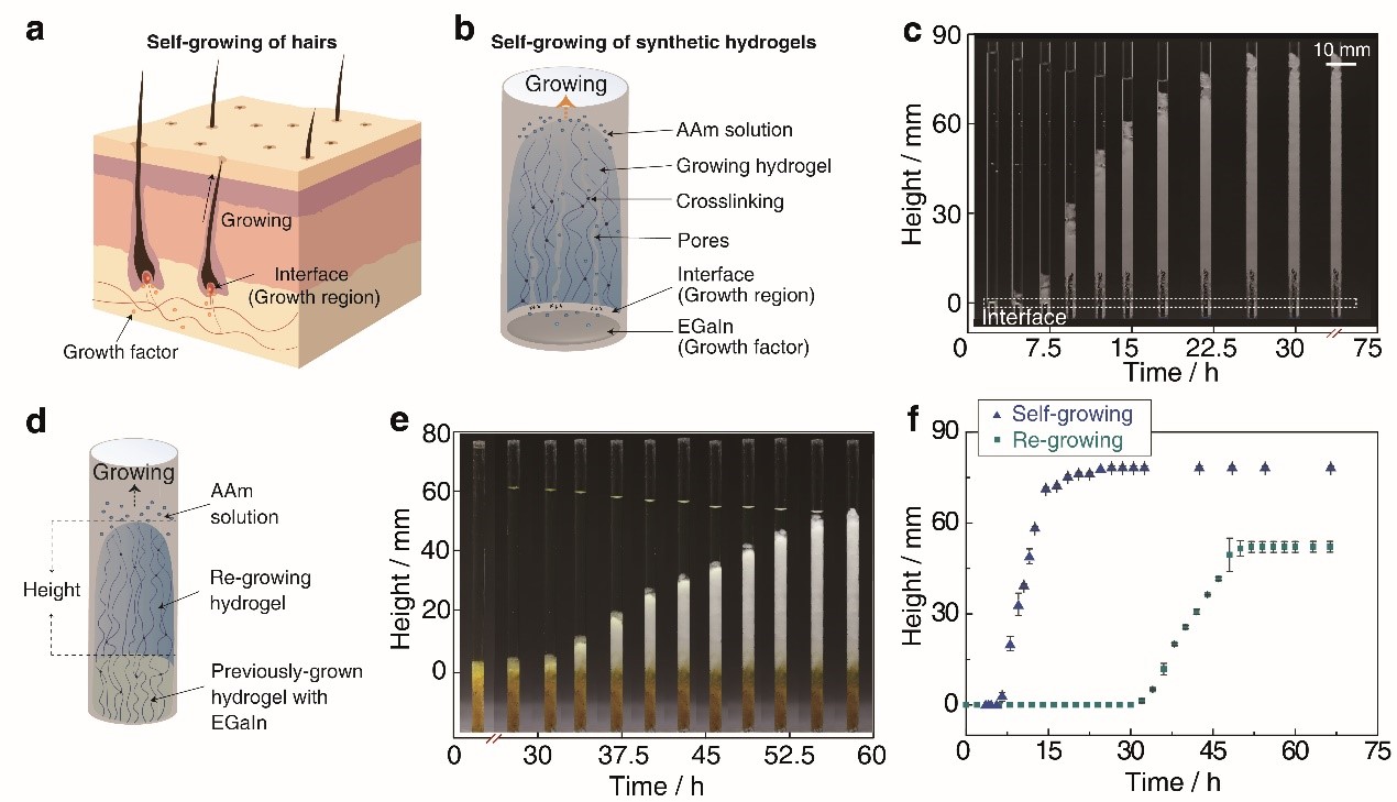 针对这一问题,受角质蛋白自生长行为的启发,团队提出了液态金属(EGaIn)和水性单体丙烯酰胺(AAm)溶液界面处的连续自由基聚合策略,赋予了人工合成聚丙烯酰胺(PAAm)水凝胶材料前所未有的自生长特性(图1 a-c)。进一步将自生长得到的水凝胶添加到单体溶液中,发现水凝胶表现出连续再生长的特征(图1 d-f)。