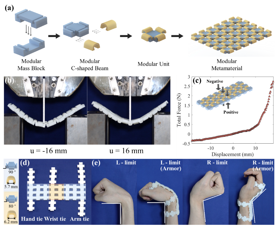 进一步,基于该稳定性增强的SVS超材料,可实现对人体关节的定制机械保护(如图3)和远程机械输入信号调节的信息转换功能(如图4)。这些成果为生成更可行的稳定性增强SVS超材料/超结构提供了有益的解决方案,并推动了它们在航空航天、医疗器械和机器人技术等领域的潜在应用。