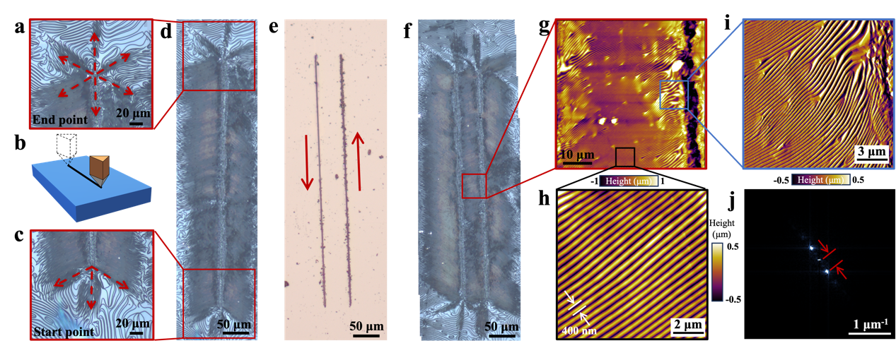 王学云,洪家旺团队在力学调控拓扑铁电畴研究中取得重要进展,相关成果以“Mechanical Manipulation for Ordered Topological Defects”为题,发表于国际权威期刊Science Advances期刊。研究团队建立了一种残余应力的力学调控策略,针对拓扑铁电畴结构,通过纳米压痕引入应力与晶格相互作用的马格努斯力,使铁电单晶中的涡旋畴呈现六重对称的分布,进而拓展压痕至划痕,通过纳米划痕将随机分布的涡旋畴调控成大面积(50 μm ´ 500 μm)、高密度(周期 400 nm)、单一手性平行条纹畴,解决了受拓扑保护的铁电畴难以在室温局域精准调控的难题,为其他铁电、铁磁和铁弹等铁性材料的畴调控及应用提供新思路。