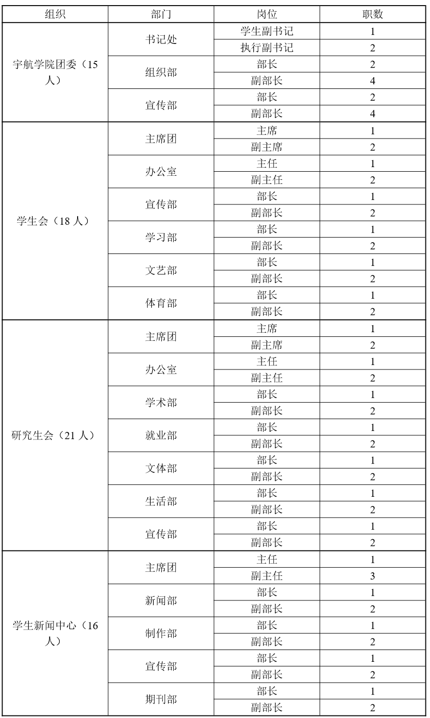 团委学生副书记面向2016级同学选拔,执行副书记面向2017级同学选拔,部长团面向2016及2017级同学选拔,每个部门正部长中关村、良乡各一名,副部长中关村、良乡各两名;