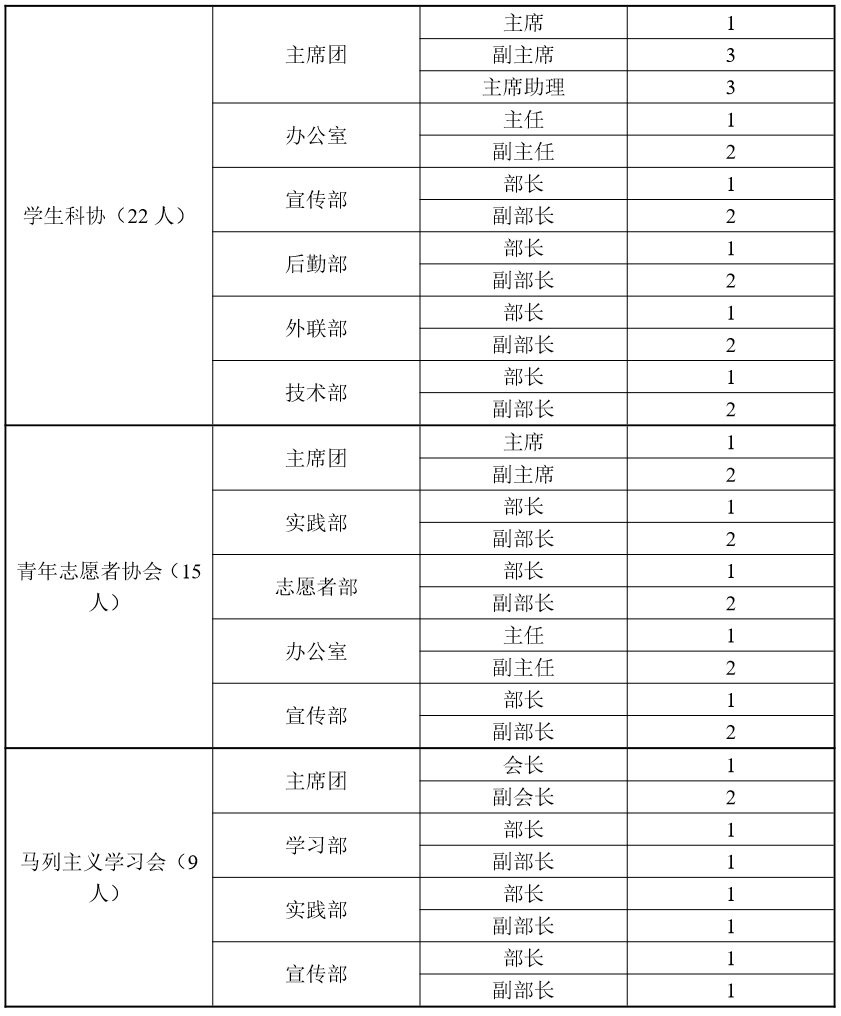 学生会、学生搜书吧、青年志愿者协会、马列主义学习会主席团面向2016级同学选拔,部长团面向2017级同学选拔。
