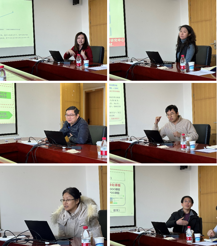 随后,胡更开教授主持了汇报环节。首先,庞海芍教授团队的隋艺老师以“工程科学实验班培养成效跟踪研究学生反馈“为题汇报了团队在跟踪实验班人才培养过程和成效方面所作的初步调研工作。报告以固体力学贯通课、流体力学贯通课为例,分“课程总体设计、教师授课情况、学生学习情况、课程教学需改进之处”等方面分别对学生们的反馈作了详细汇报,引起与会教师的热烈讨论。其后,固体力学、流体力学、动力学与控制、数理方法等四门贯通课的主讲教师刘刘、王晓亮、罗凯、靳艳飞分别代表各自团队汇报了每门课程的课程分工、教材情况、近两年的计划、当前存在的问题及对策等课程建设情况;周萧明汇报了力学专业核心课程的知识图谱建设进度和后续安排。