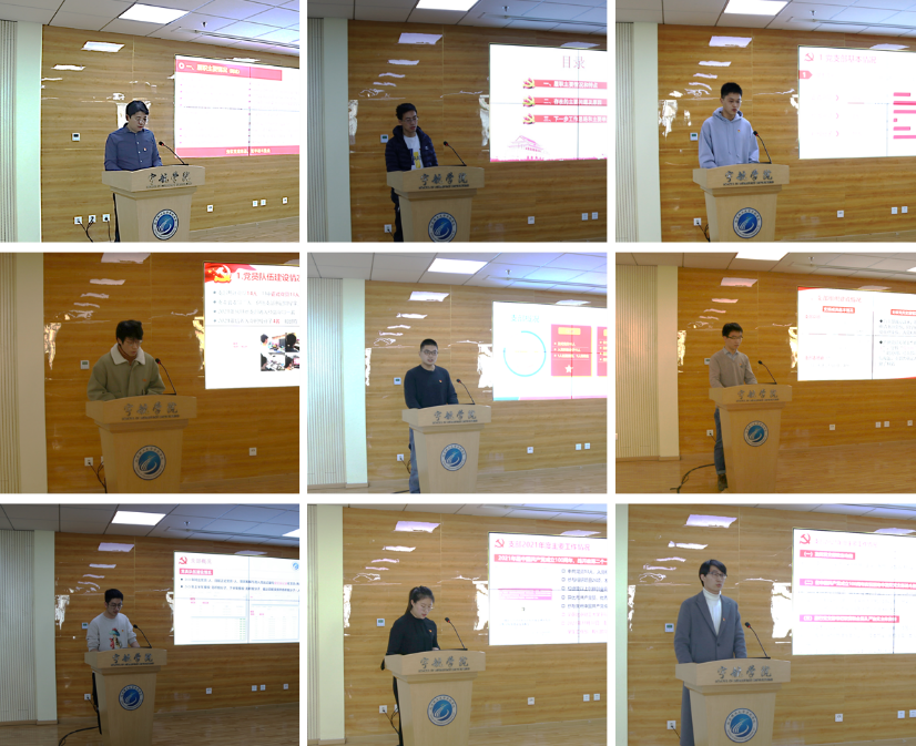 学院1名教工党支部书记和8名学生党支部书记围绕履职主要情况、特色工作、存在的主要问题和原因、下一步工作思路和主要举措等方面进行现场述职,其余22位党支部书记进行书面述职。