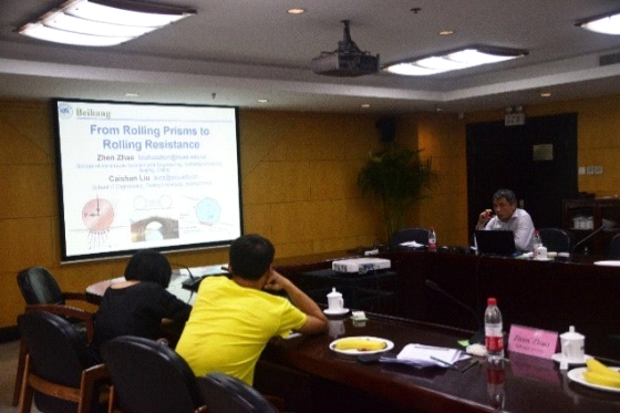 会议安排了如下11个报告:航天504所张华振博士—Deployment Study of Tetrahedral Truss Reflector,北京大学刘才山教授—Domino dynamics,清华大学任革学教授—The Arbitrary-Lagrange-Eulerian Formulation of Absolute Nodal Coordinate Element of Linear Medium and Its applications,天津大学王树新教授—Design of Hybrid-driven Underwater Gliders Based on Multibody Dynamics,青岛大学丁洁玉副教授—Large Rotation Vector Formulation for Dynamics of Flexible Beams,南京理工大学章定国教授—Progress in Dynamics of Flexible Multi-body Systems at Nanjing University of Science and Technology,大连理工大学齐朝晖教授—Frictional Contact Analysis of Joints in Multibody Systems,华中科技大学陈立平教授—From Multi-body System to Multi-physical System (Modelica in China),上海交通大学刘锦阳教授—Numerical Investigation of Contact-impact Based on CMS Method and Experimental Validation Using DIC Technique,北京航空航天大学赵振副教授—From Rolling Prisms to Rolling Resistance,北京航空航天大学文力副教授—Bio-inspired Multi-material Structure and Soft Robotics。每个报告之后均进行了热烈讨论,激发了与会专家和研究生的思考和交流。