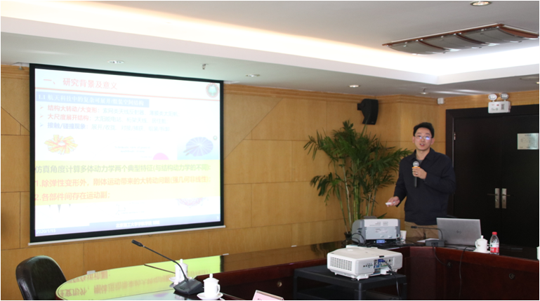 张金会教授和刘铖特别研究员结合重点实验室支持的课题,分别作了“火星探测器进入段高精度控制”和“基于局部标架的新一代多体系统动力学建模理论及通用并行算法研究”的学术报告。