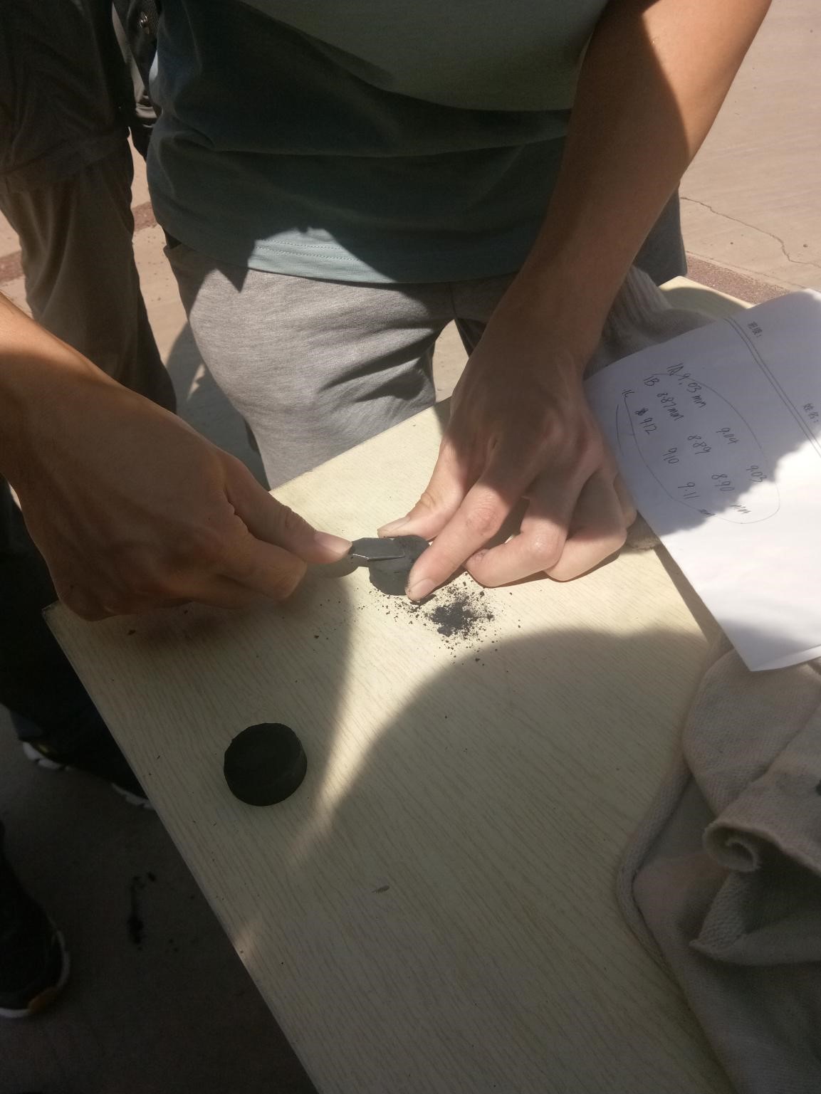 首先,教同学们用百分表和游标卡尺测量药片的厚度,进行实验前的准备工作。在老师和助教的帮助下,同学们井然有序地对样品进行了编号,并认真测量、记录了烧蚀前的样品厚度。