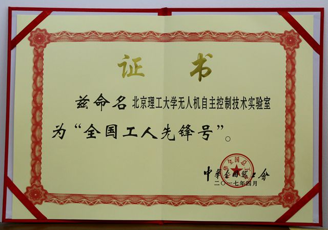 无人机自主控制技术实验室荣获2017年度“全国工人先锋号”称号。