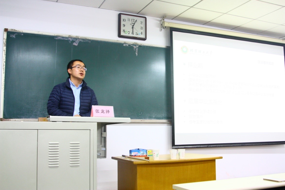 首先,张龙泽老师详细介绍和解答了就业过程中经常遇到的各类问题,为同学们在就业过程中维权、保证顺利就业给予了指导。如:国家针对“实习期”的规定,“报到证”的办理、作用及意义,户口的迁入迁出等等,并列举了许多案例;其次,张老师介绍了国家对于毕业生所给予的优惠政策和相关规定,包括参军、基层村官以及各级政府对学校招收的定向生等政策,在一定程度上拓宽了同学们的就业视野,为毕业生就业提供了更多渠道。随后,张老师还介绍了我校毕业生就业信息网等相关就业指导和信息发布网站,让有意愿就业的同学多多关注。另外,对于考研同学的就业问题,张老师提醒大家关注“春招”,届时也会有不少企业前来招聘。