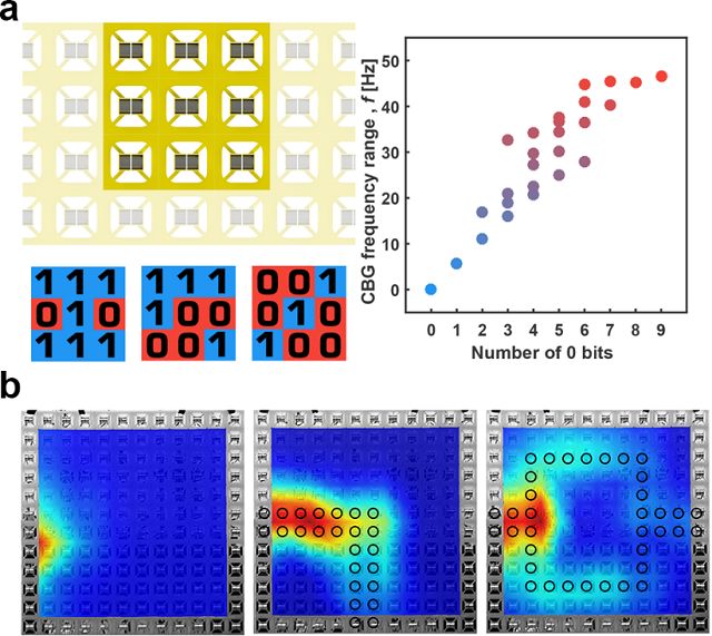 图2: a) 通过调节超胞中0和1单胞的数量及分布情况,实现了禁带宽度的精准调节;b) 通过切换单胞状态,可实现任意形状波导。
