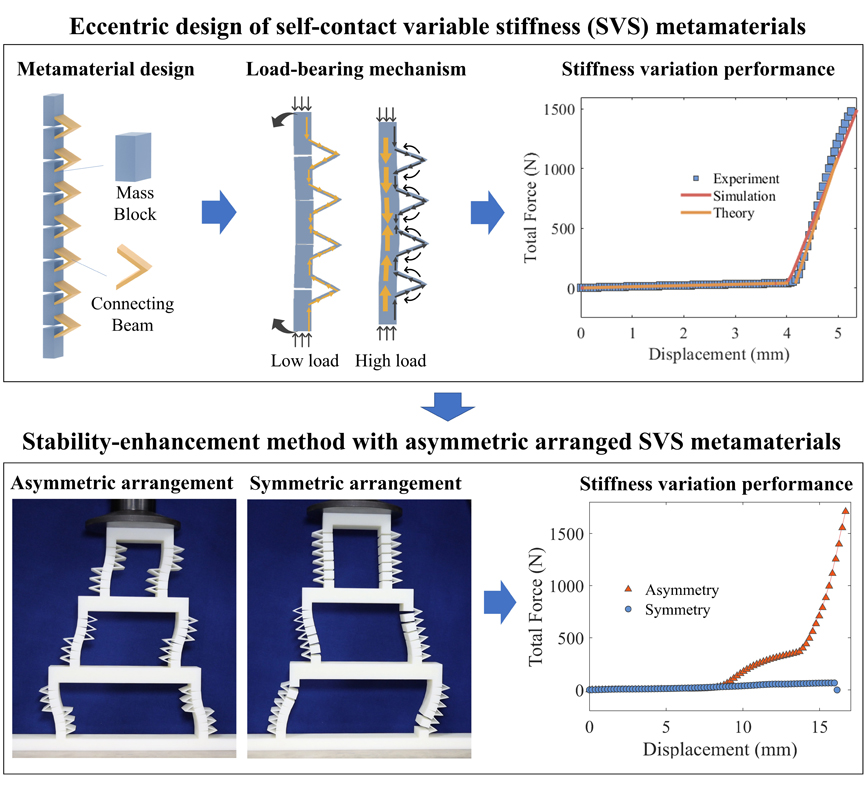 工程领域对结构刚度要求日益复杂,使得传统材料难以满足多变的设计需求。在这种背景下,可变刚度材料应运而生。作为可变刚度材料之一,自接触变刚度超材料(Self-contact variable stiffness metamaterials)通过改变其力传递路径,实现了特定的弹性应变能存储模式,进一步实现刚度调节,解决了常见变刚度超材料需要外部驱动或刺激场的不足。然而,由于超材料制造过程中不可避免地存在不规则结构、偏心和缺损等不足,现有的自接触变刚度超材料大多难以稳定地实现预期设计的应变能存储模式,其实际的刚度变化范围受到很大影响。